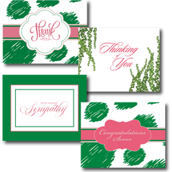 Send a handwritten note of support and encouragement to your sorority sister with this assorted box of note cards. Let her know that you've got her back, love and support her! Two note cards each: thank you, sympathy, thinking of you and congratulations
