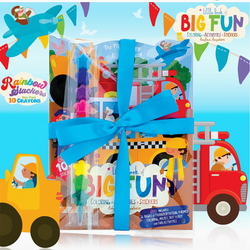 Gift pack includes 1 Crazy Car Town Little Book of Big Fun and 1 Star Rainbow Stacker wrapped up with a pretty bow. Easy to grab-and-go! ๐๐ข๐ญ๐ญ๐ฅ๐ ๐๐จ๐จ๐ค ๐จ๐ ๐๐ข๐ ๐ ๐ฎ๐ง This little book packs a ton of big fun inside! Coloring pages, activities and stickers are included in an adorable little book to take on-the-go! Over 100 stickers included inside as well as 24 pages of delightfully illustrated activities for at home or on-the-go, including: pictures to color, mazes to solve, dots to connect, space to doodle, differences to spot and imaginations to spark. ๐๐๐ข๐ง๐๐จ๐ฐ ๐๐ญ๐๐๐ค๐๐ซ Color with a full rainbow of crayons in one convenient stack! Each stacker includes 10 non-toxic crayons in a star shape. These fine tipped crayons are great for detail coloring!