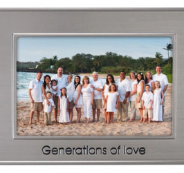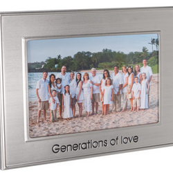 Add a touch of style to your home decor with this classic metal photo frame. This frame, constructed of dimensional metal, is designed to hold one 4” x 6” horizontal photo. The title “Generations of Love” is debossed and filled with black paint. The brushed pewter finish complements the debossed text beautifully. Raised borders along the inner and outer edges define the frame for a finished look. It is simple to load with a removable sturdy black felt flocked back. This freestanding, easel-backed picture frame will display perfectly on a table or shelf. Optionally, use the attached hardware to create a unique wall display. This picture frame includes a durable glass front that will protect and showcase your precious photos for years to come.