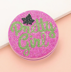 Sparkle on the go with this compact mirror featuring vibrant rhinestones and a bold “Pretty Girl” design. A stylish accessory for touch-ups and a fun, fashionable gift choice for beauty lovers.