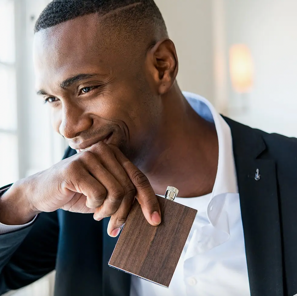A personalized hip flask is a perfectly discrete gift idea Whether you fill it with whiskey, brandy, or some other favored liquor, this 3oz. wood wrapped stainless steel straight flask slips into any pocket seamlessly.